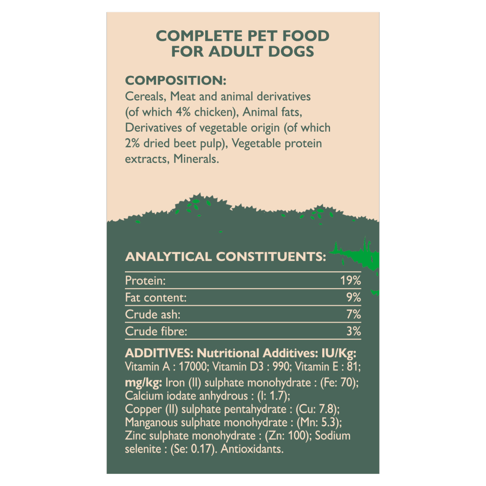 Composition: Cereals, meat and animal derivatives (of which 4% chicken), derivatives of vegetable origin (of which 1.5% dried beet pulp), oils and fats, vegetable protein extracts, minerals.