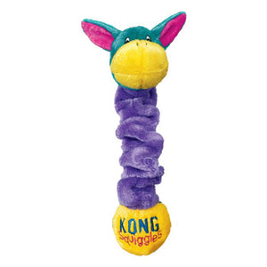 KONG Squiggles are stretchy, floppy, squeaky fun for dogs and their owners. These colorful toys come in an assortment of four cute characters and feature a long, stretchy body, plus squeakers at both ends. Designed with minimal stuffing for minimal mess.  Available in three sizes: small, medium and large.