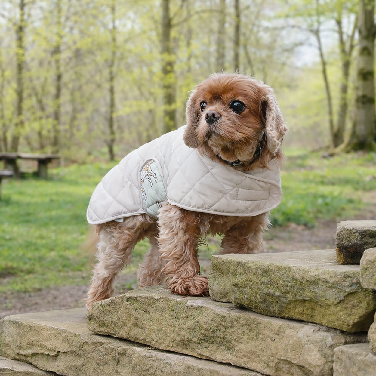 The water-resistant outer layer helps protect against unexpected showers, while adjustable Velcro fastenings ensure a snug, comfortable fit that doesn’t restrict movement. Whether it’s a morning stroll or a weekend outing, this coat keeps your pup wrapped in comfort and looking effortlessly chic.