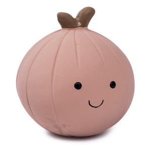Fun Foodie Face Onion shaped latex squeak ball for throw and fetch amusement for your dog.