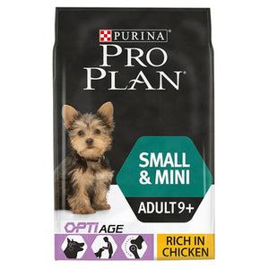 Complete Pet Food for Small and Mini Size Dogs Aged from 9 Onwards A combination of key nutrients that helps to support healthy joints for your senior dog's active lifestyle purina pro plan Small & Mini Adult 9+ with optiage is a complete senior dry dog food containing a patented blend of nutrients including medium chain triglycerides an alternative brain energy source from botanical oils that have been proven to help promote alertness and mental sharpness in dogs 7+, with visible results within 30 days. It also helps increase their interest in playtime so you can enjoy your life with them for as long as possible.We only use high quality ingredients that have been carefully prepared so they retain more of their goodness. The easy-to-chew kibble sizes in this dry dog food have been specially adapted for small mouths. Balanced minerals, vitamin D and the crunchy texture helps support healthy teeth and gums. The increased** levels of vitamin E and C in our dry dog food for small senior dogs also help fight the challenges of ageing, so your dog can enjoy support for their long-term health. Patent pending (for Europe) versus small & mini adult.