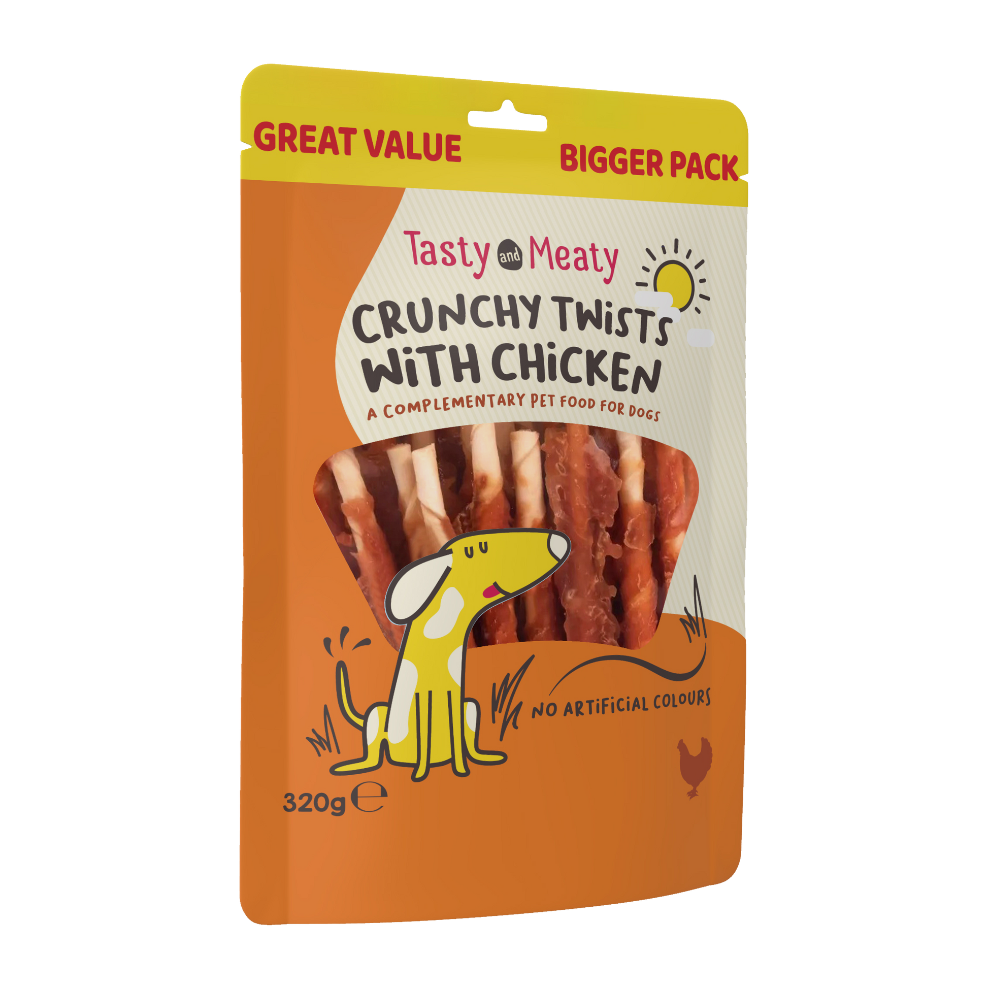 Treat your dog to the irresistible taste of our Tasty & Meaty Chicken Crunchy Twists Dog Treats. Bursting with rich, meaty flavour, these delicious dog chews are made with natural chicken and are free from artificial colours and flavours. Perfect for dogs who love to chew, these easy-to-digest dog treats provide a long-lasting, satisfying experience that keeps your dog entertained and engaged.