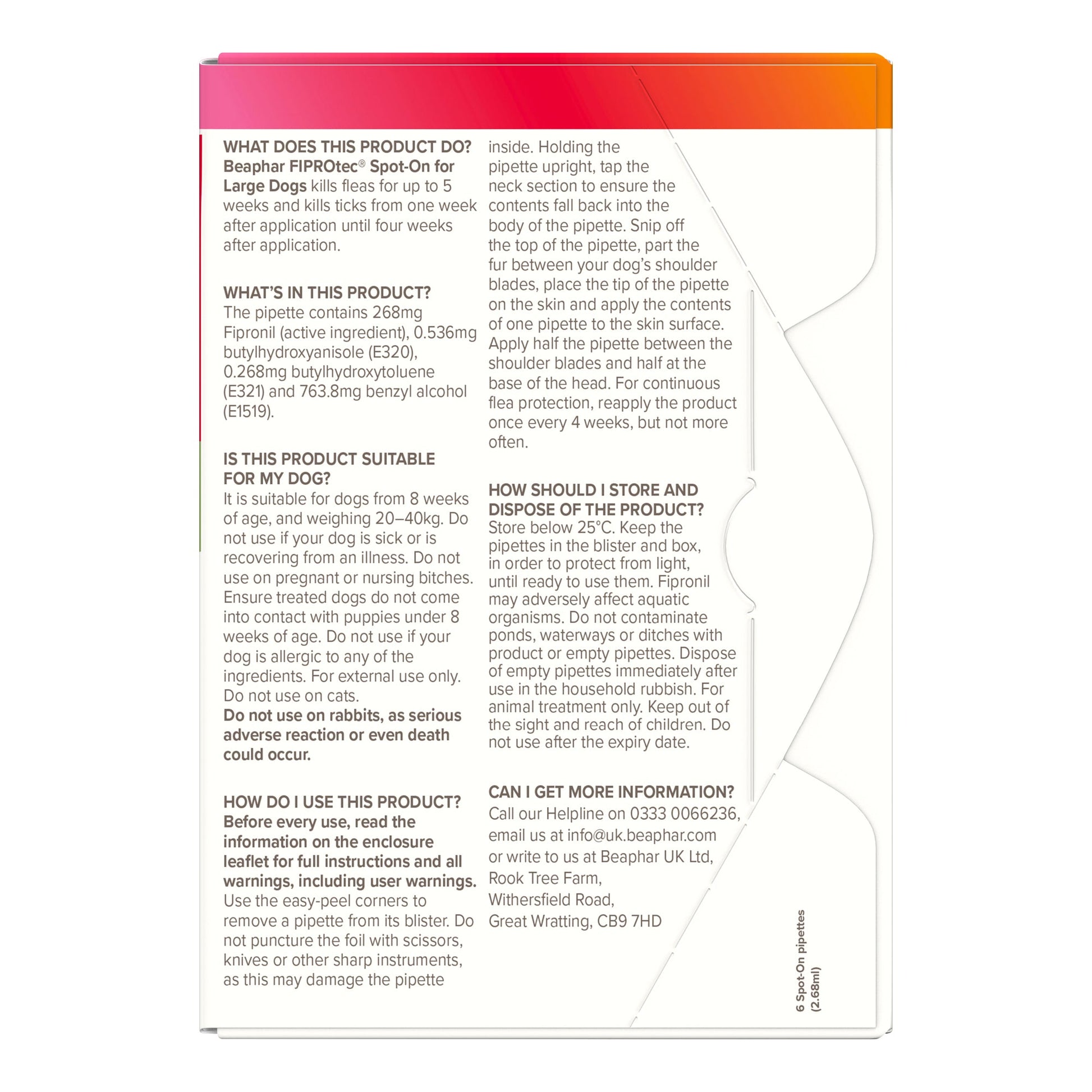 Beaphar FIPROtec Spot-On for Large Dogs is a veterinary medicine available without prescription, that helps control fleas and ticks. Containing fipronil, this spot-on treatment for dogs kills fleas within 24 hours and ticks within 48 hours. Apply monthly for continuous flea protection. Suitable for dogs from 8 weeks of age and weighing 20-40kg.