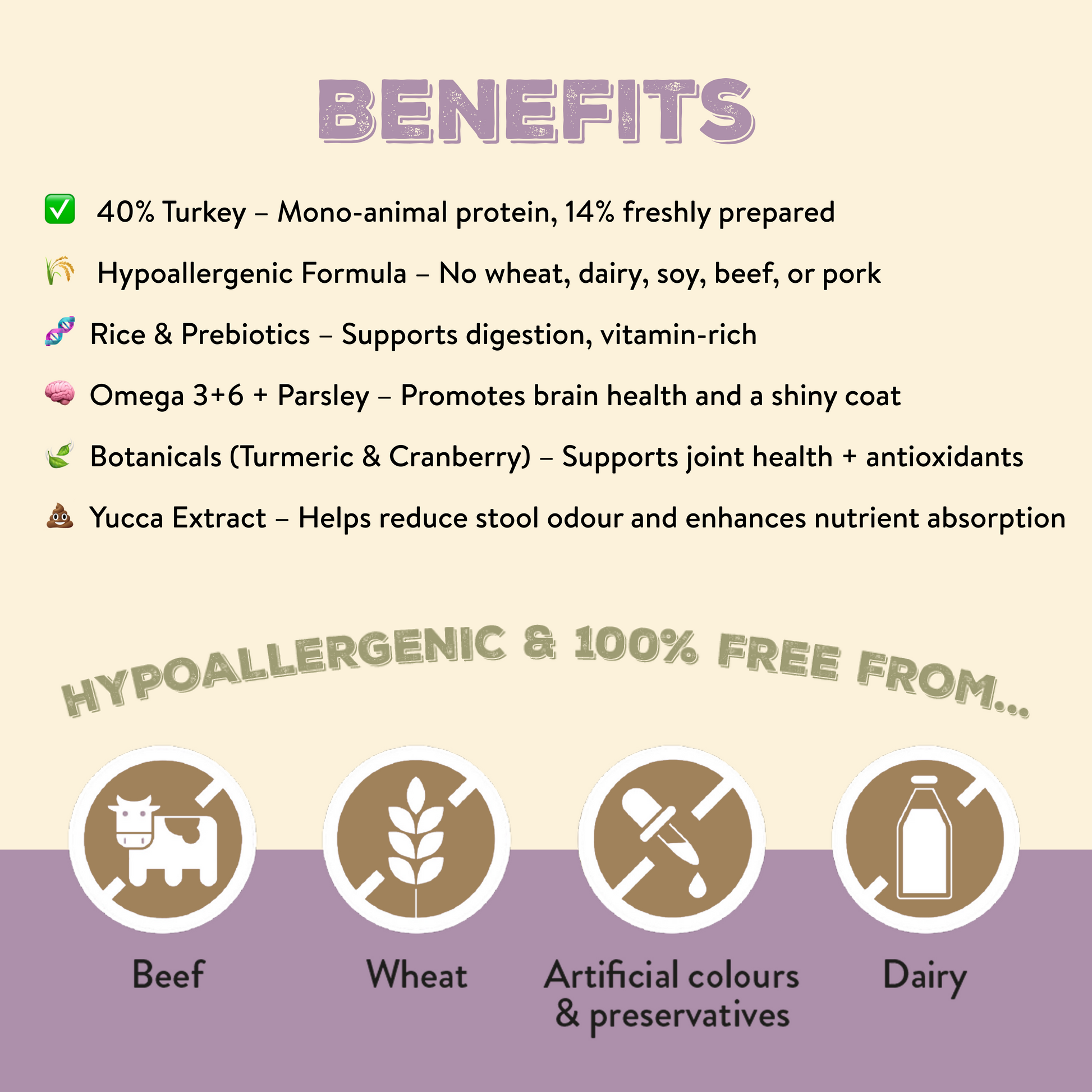 40% Turkey (14% freshly prepared): High-quality protein for muscle growth and development.