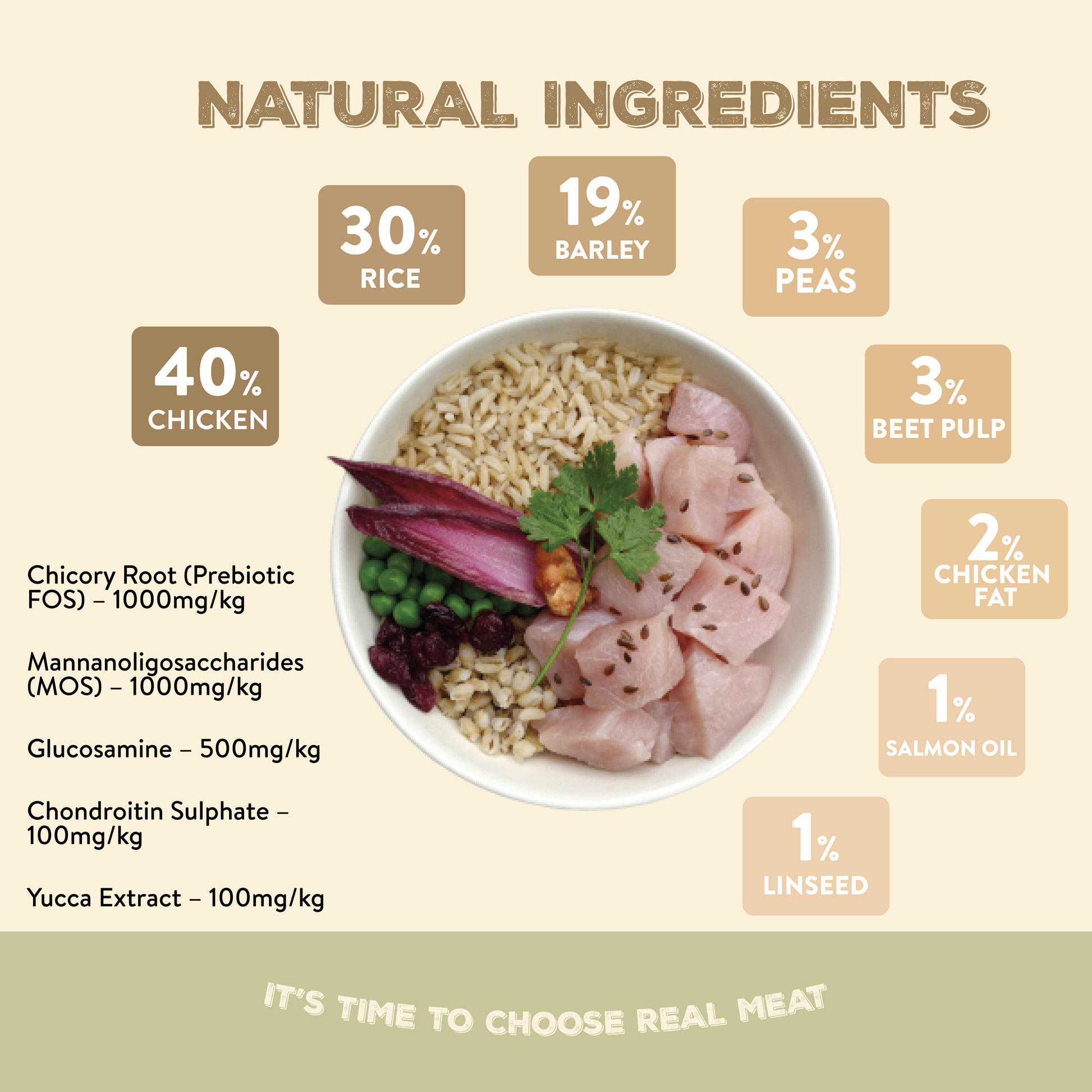 40% Chicken (Including 14% Freshly Prepared): High-quality protein for muscle growth and development.