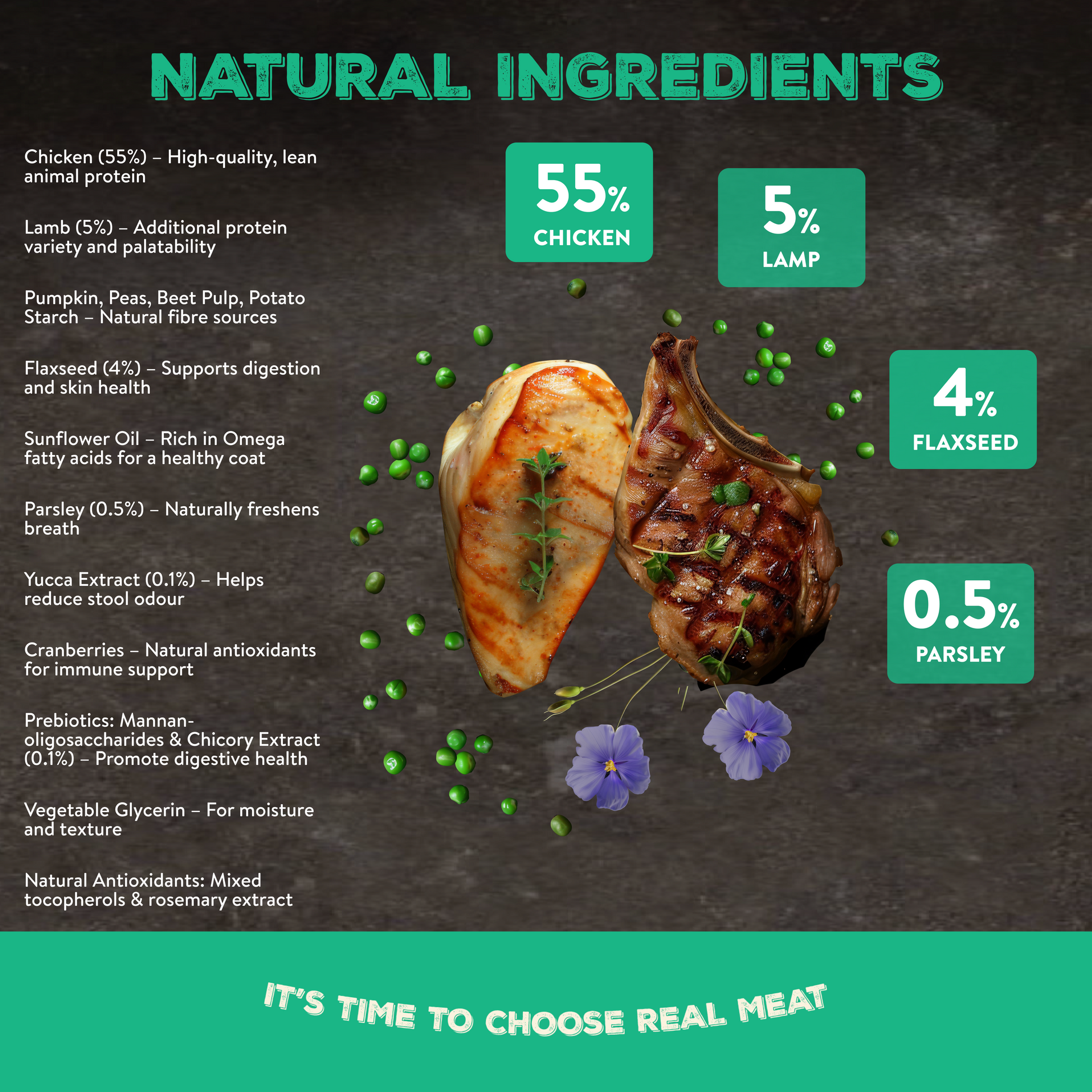 • 55% Chicken & 5% Lamb: High-quality protein for muscle growth and development.