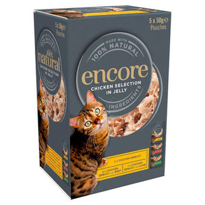 A complementary pet food for adult cats. Encore Chicken Selection pouch multipack is made with 100% natural ingredients and more real meat. Each recipe is filled with delicious shredded chicken in a soft natural jelly, that has been carefully selected for taste, quality and nutrition. Each handy to open pouch provides a natural source of Taurine and Omega 3, to help keep your cat healthy and happy. No artificial colours, flavours or preservatives are added to our food, so there will be nothing left in the bowl! Made with 100% natural ingredients, High meat content, Natural Source of Taurine, Soft, natural jelly with no added sugars.