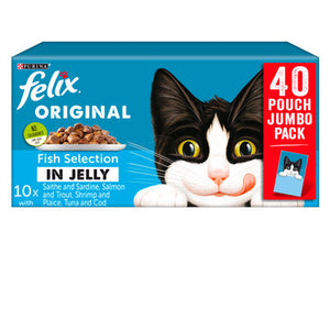 Source of Omega 6 and specially added antioxidants support natural defences and keep your cat fighting fit. The ultimate selection of cat food for fish-loving felines felix Adult Cat Fish Selection in Jelly provides your adult cat with a fish feast they can enjoy whilst receiving 100% of their daily needs through the high quality nutrition we include. Our vets and nutritionists have specially formulated each recipe to include an assortment of vitamins and minerals that take care of your cat during his adult years. Our recipes include saithe with sardine, salmon with trout, shrimp with plaice and tuna with cod so your cat can try an assortment of flavours and benefit from a varied diet every day.