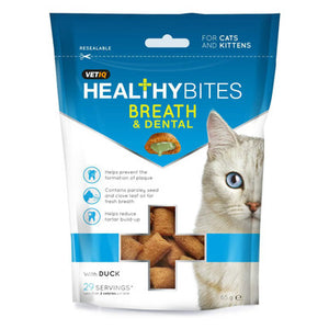 Healthy Bites Breath & Dental are delicious dual action treats formulated to comprise a dry outer shell which massages gums and scrapes the tooth surface and a health enhancing cream filled centre containing natural anti-bacterial, anti-microbial and breath freshening ingredients. These high palatable bites are approved by veterinarians and have no artificial colours, flavours or preservatives and are wheat free too.