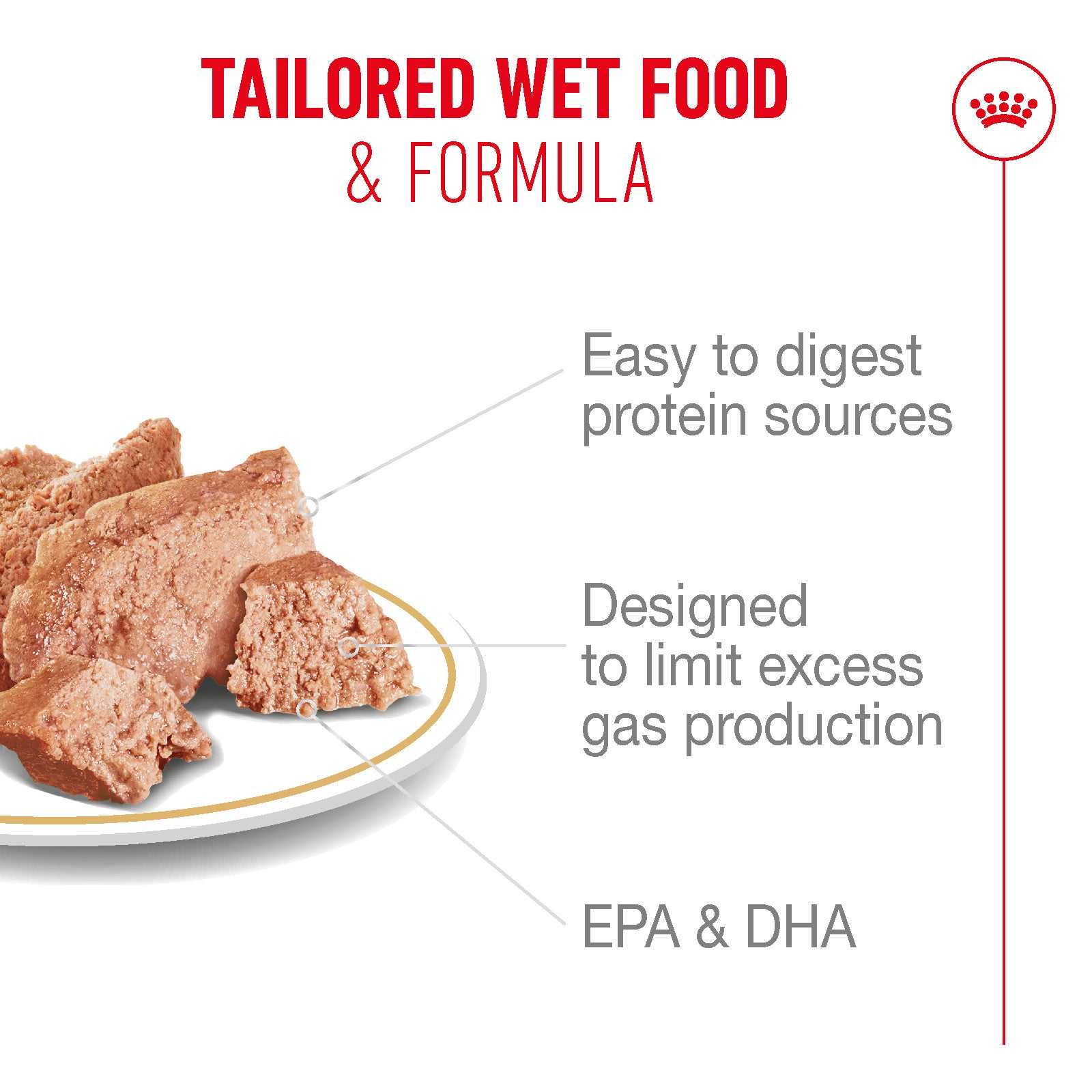 At Royal Canin, we believe every dog is unique. By researching breed-specific traits and combining scientific and nutritional expertise from our network of specialists, we create tailored nutrition to meet the precise needs of your dog. ROYAL CANIN French Bulldog Adult is a complete and balanced wet food diet for French Bulldogs aged 12 months and over. Digestive health: This formula supports your French Bulldog’s digestive health with highly digestible proteins and a selection of specific fibres which contribute to optimal stool quality. Bone and joint support: ROYAL CANIN French Bulldog Adult also supports bone and joint health thanks to the inclusion of EPA and DHA, as well as precise levels of calcium and phosphorus. Healthy skin and coat: This diet supports the skin’s “barrier” function through a tailored complex of nutrients and helps maintain a healthy coat with EPA and DHA. Loaf texture: With its soft loaf texture, ROYAL CANIN French Bulldog Adult offers a palatable mealtime experience. Important to note: Please make sure you follow the on-pack feeding guide to ensure the correct rationing amounts.