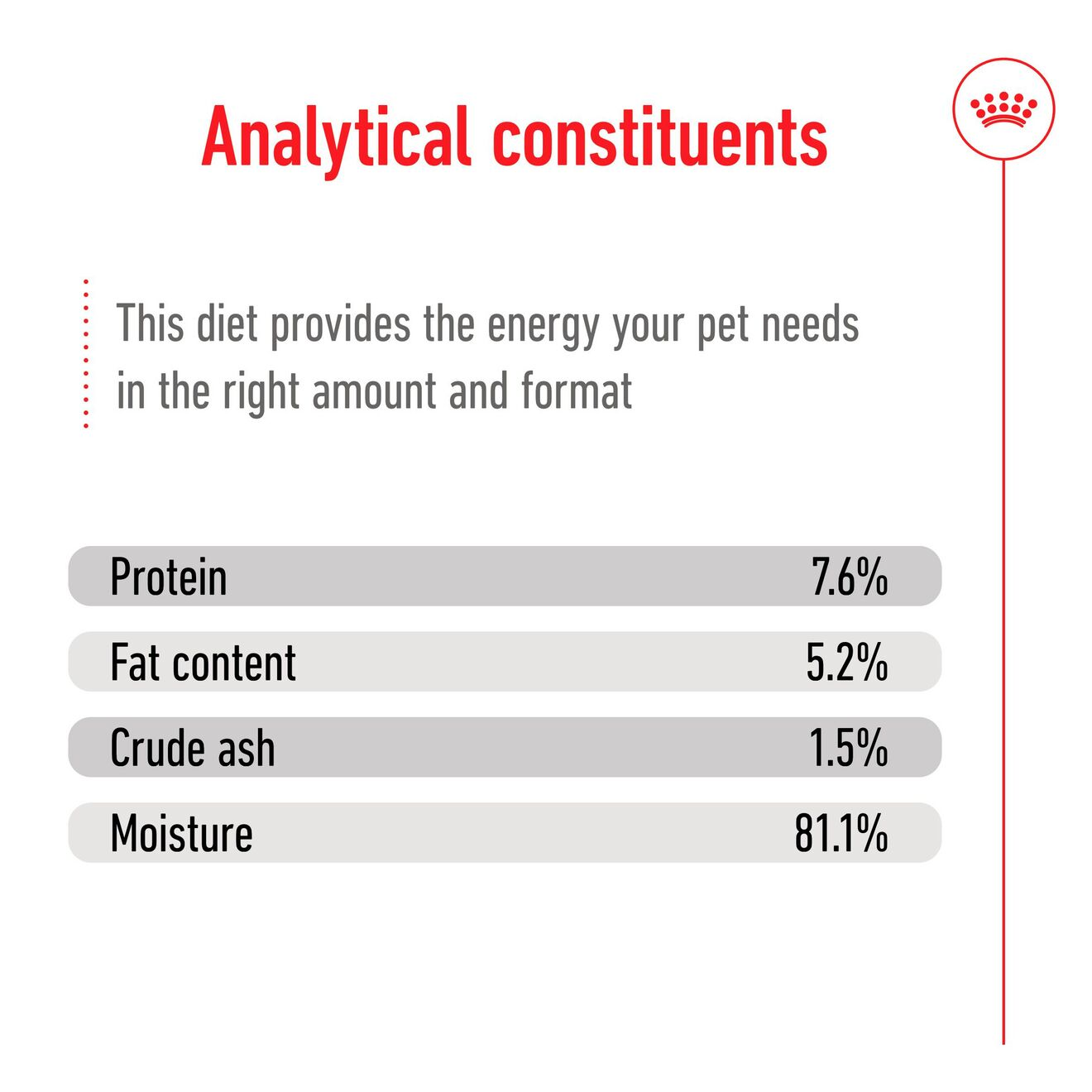 Analytical Constituents: Protein: 7.6% - Crude fibres: 0.8% - Fat content: 5.2% - Crude ash: 1.5% - Moisture: 81.1% - Metabolisable energy: 867 kcal/kg.