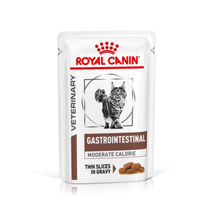 Overweight cats – or those prone to weight gain – with digestive sensitivities can benefit from a tailor-made diet which provides nutrients that help to support good digestion and healthy weight management. Available in 85 g pouches, Royal Canin® Gastrointestinal Moderate Calorie in Gravy is specially formulated to support the nutritional needs of overweight adult cats with digestive sensitivities. This highly digestible formula incorporates a good balance of fibres – including prebiotics – to support healthy digestion and transit. Prebiotics can help to stimulate a healthier digestive environment by encouraging a good balance of beneficial bacteria in your cat’s digestive tract. Thanks to its moderate calorie content, Royal Canin® Gastrointestinal Moderate Calorie in Gravy helps to limit weight gain in overweight cats or cats with a tendency to gain weight. If your cat suffers from digestive issues, you may notice that their appetite has decreased. Royal Canin® Gastrointestinal Moderate Calorie in Gravy is a highly palatable diet that helps to stimulate your cat’s appetite whilst helping them to feel full. As part of the Royal Canin® Veterinary Range, it is important that this product is only given to your pet when recommended by a veterinary professional. To cater to each cat’s individual preferences, Royal Canin® Gastrointestinal Moderate Calorie in Gravy is also available as dry kibble. If you’re considering mixed feeding, simply follow the on-pack feeding guidelines to ensure your cat gets an accurate amount of both wet and dry food for optimal benefit. At Royal Canin® we’re committed to providing nutritional solutions to your pet’s needs. All our products undergo an extensive quality control process in order to guarantee the optimum quality of food, as well as catering to your cat’s specific dietary requirements and lifestyle. This means that when your cat eats Royal Canin® Gastrointestinal Moderate Calorie in Gravy, it’s getting a complete and balanced diet.