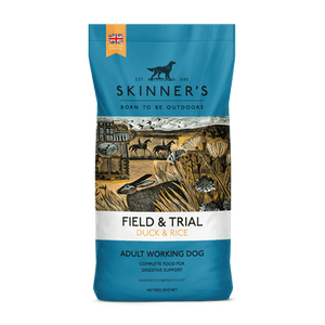 Skinners Field and Trial Duck & Rice. Field & Trial Duck & Rice is free from wheat gluten, maize gluten, barley gluten, soya and dairy products. Made with British duck meat meal, rice and oats, Field & Trial Duck & Rice also contains all the essential vitamins, minerals and carbohydrates needed for health, vitality and sustained stamina. As a valuable source of energy and to maintain healthy coat condition, Field & Trial Duck & Rice is also coated in sunflower oil. Field & Trial Duck & Rice also contains enhanced levels of Glucosamine and Chondroitin to help protect the joints of your dog.