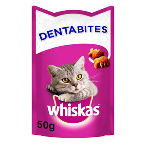 Whiskas Dentabites dental cat treat is designed, when fed daily, to reduce the build-up of tartar on cat's teeth (*the recommended daily feed is 16 kibbles per day), Whiskas Dentabites cat dental treats are scientifically proven to reduce the build-up of tartar, A treat for cats that has a special texture designed to gently clean teeth. This dental cat treat helps to reduce the build-up of dental deposits; a cat treat that provides effective oral care, Prepared with tasty chicken or salmon, so that your cat will love these dental treats, Cat dental treats with added vitamins and minerals, no artificial flavours and less than 2 Kcal in every cat treat.